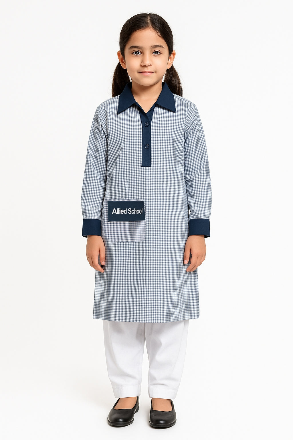 Give your child a graceful and well-groomed appearance with this smart Blue check kameez accented with navy blue cuffs and collar, perfectly matched with a white shalwar. Designed to reflect discipline and neatness, this uniform is ideal for daily school use.